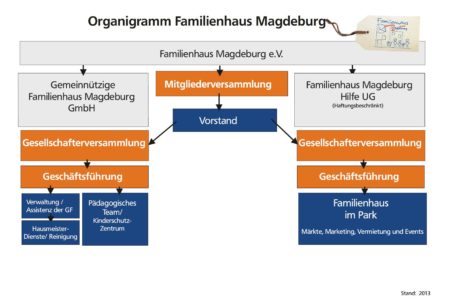 Das Familienhaus Magdeburg ist als gemeinnütziger Verein, gemeinnützige GmbH und UG (haftungsbeschränkt) organisiert. Der Verein wurde 2007 gegründet und wird durch einen dreiköpfigen, ehrenamtlich arbeitenden Vorstand vertreten. Der Verein ist Mehrheitsgesellschafter bei der gemeinnützigen Familienhaus Magdeburg GmbH und Hauptanteilgesellschafter der Familienhaus Magdeburg Hilfe UG (haftungsbeschränkt). Beide Gesellschaften werden durch die Geschäftsführer Marina Wölk und Thorsten Giefers gemeinschaftlich geleitet. Die gemeinnützige Familienhaus Magdeburg GmbH ist die „soziale“ Gesellschaft. In ihr sind die Erziehungshilfen, die sozial-pädagogischen Projekte und der gemeinnützige Betrieb des Familienhaus im Park und des Familienhaus Börde organisiert. Hinzu kommen Flohmarkt und Schulbegleitung als Dienstleistung. Die Familienhaus Magdeburg Hilfe UG managt die Bereiche Gastronomie, Veranstaltungs- und Vermietungsmanagement des Gesamtgefüges.